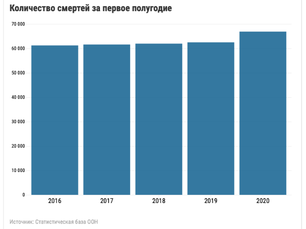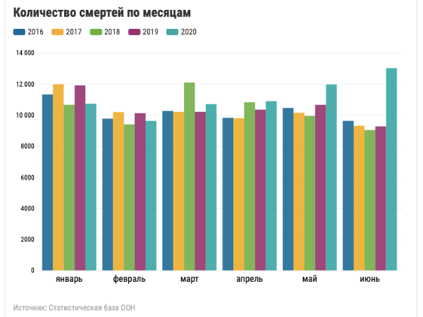 По данным статистики можно проследить, что увеличение количества смертей происходит с февраля и достигает своего пика на цифре в 13 016 человек в июне месяце. Напомним, что в июне прошлого года было зафиксировано 9263 смертей.